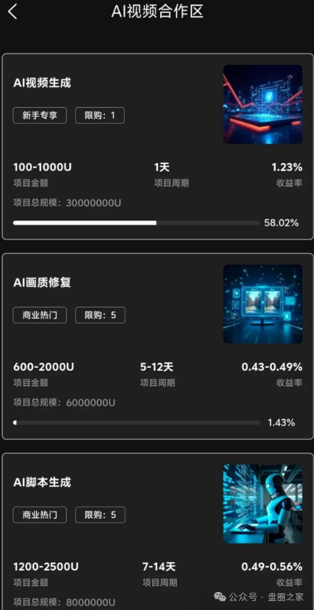 诈骗手法:以 “AI 视频生成” 为噱头,采用 “U 进 U 出” 模式,宣称投资 100-2500U 可获 0.43%-1.43% 日收益,项目总规模虚标至 3000 万 U。其本质是典型的分红类资金盘,靠新资金填补旧资金窟窿,目前已被多个渠道标记为 “高风险预警”。