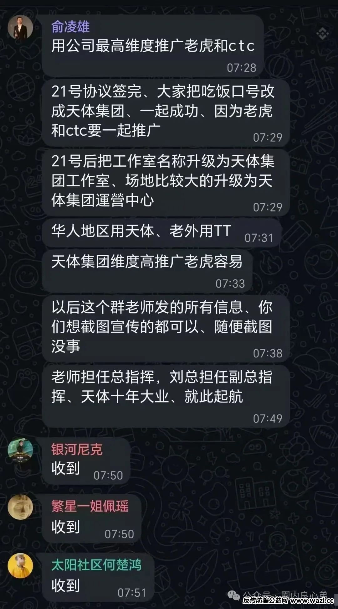俞老师的割韭菜杰作,双手都是数不过来的,当年发行的项目,幸孕链、黄金币、万象、金猫、Youbank、满星云、温莎,俞凌雄圈的钱几辈子都花不完了吧,他还真是努力,一把合格的镰刀,回头看看这些韭菜,完全没有自己的想法,人云亦云,不割你们割谁,当年万人“血书”实名举报俞凌雄,如今的天体交易所,又到所谓老虎TigerAI,不过是其换汤不换药的“新马甲”,最终都是崩盘跑路收割韭菜的,各自屏幕前的投资者都清醒一点。