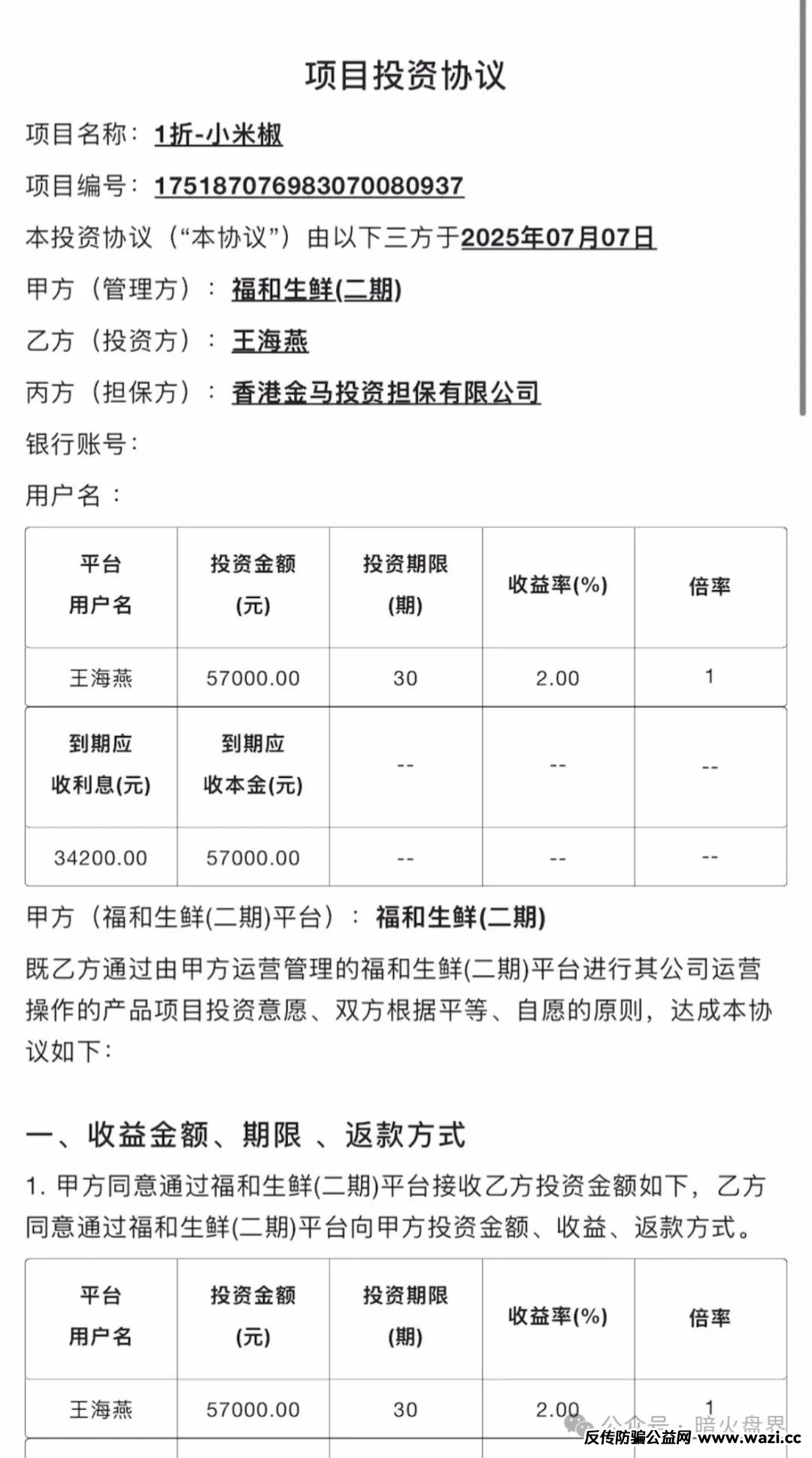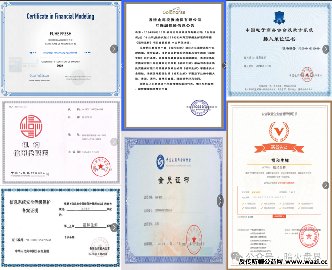 这是今天要讲的“福和优选”的资料介绍,也叫福和生鲜,各位自己看吧,暗火就不多说了,其实也没什么可以说的,都是杀猪盘老套路,就是编造谎言,至于那些证件资质,舍得花钱就买,不舍得花钱就P图,有些人是专门吃这碗饭的,几千一万就能搞一套证件资质,像亚盟联盈和众海联盟这种就是花钱买的。
