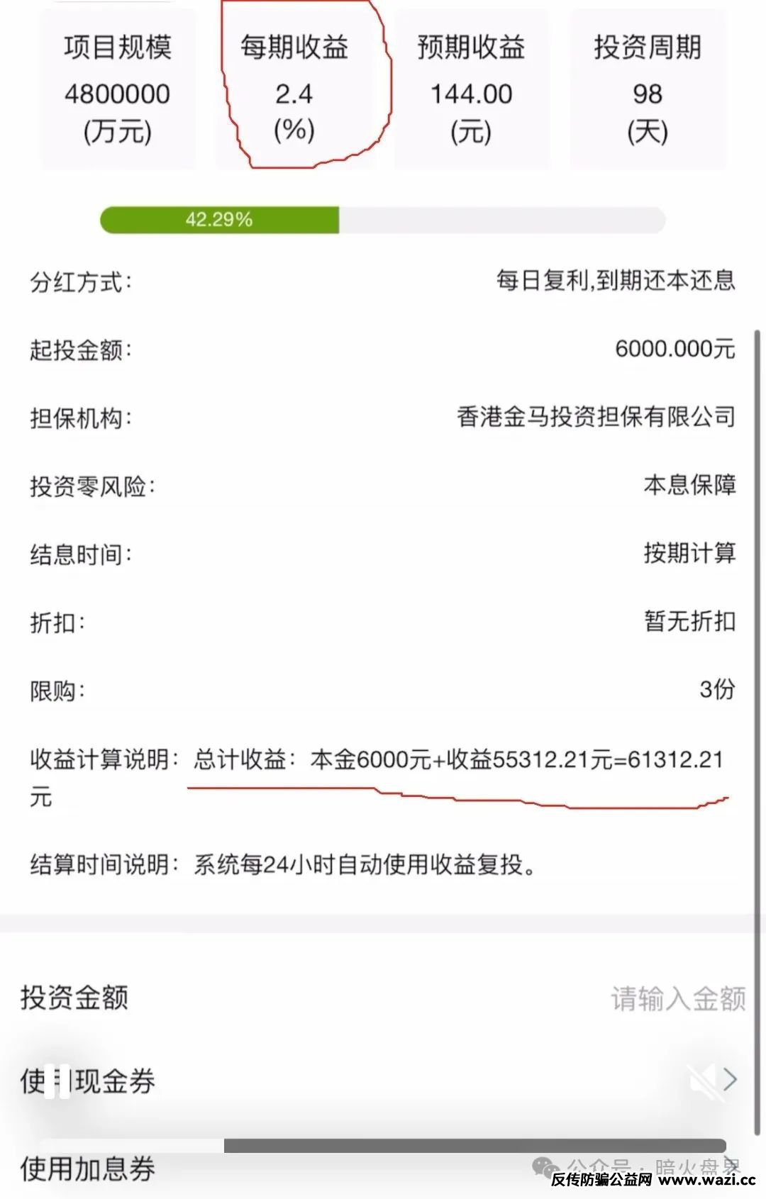 这种投资就是一眼假的东西,投资6000,98天的收益是6万多,回报率1000%以上,那些朝九晚五的还上什么班,都来投资这个不是可以财富自由躺平了吗?