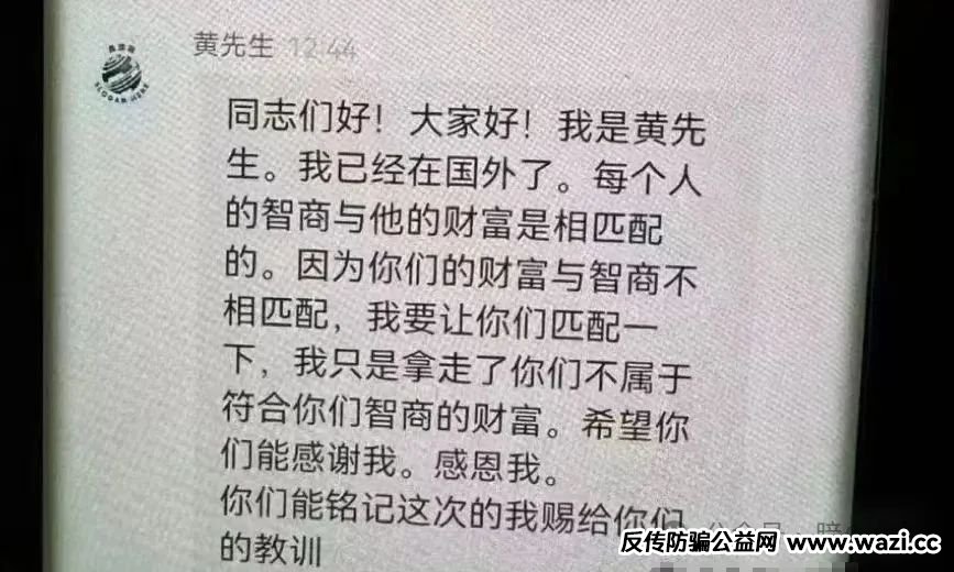 前段时间鑫慷嘉的操盘手“黄先生”跑路后,发的退场声明太经典了:“因为你们的财富与智商不相匹配,我要让你们匹配一下,我只是拿走了你们不属于符合你们智商的财富。”这段话充满了嘲讽与嚣张,但却是事实。