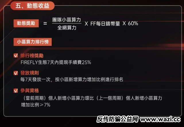 团队收益:按小区算力(团队投资额)瓜分全网FF日产量的60%;