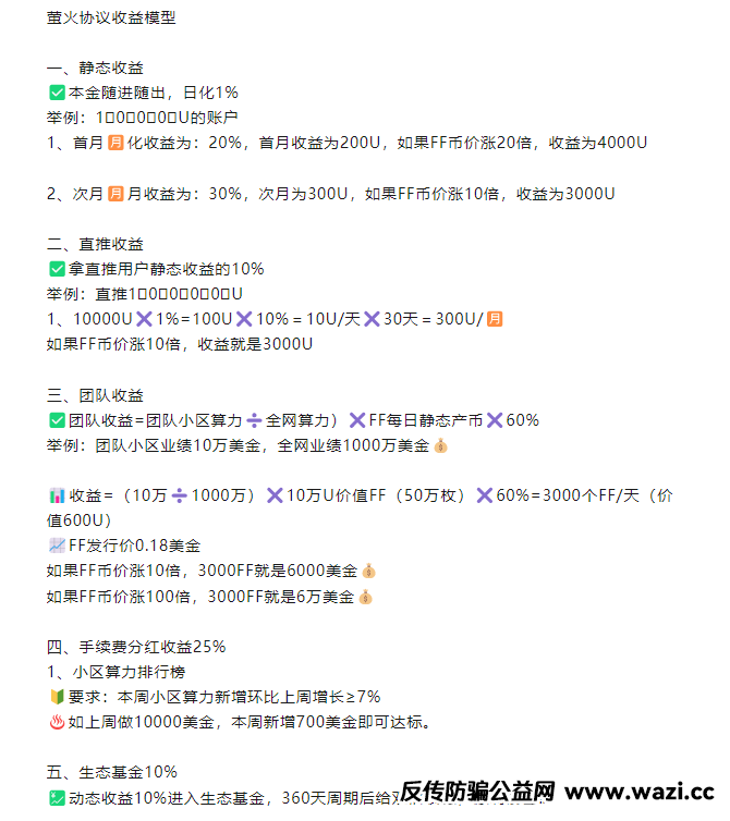现在萤火协议(FIREFLY)的区块链项目在东南亚社区疯狂扩散。其宣传的日化1%随进随出双倍暴富等口号吸引大量散户入场。然而,调查发现,该项目实为披着加权分红外衣的传销盘,通过精巧的双币循环陷阱与静态收益骗局收割投资者。