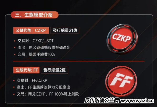 FF(生态币):总量2亿枚,用户质押CZKP挖取FF,卖出时需闪兑CZKP并100%销毁,制造通缩升值假象。