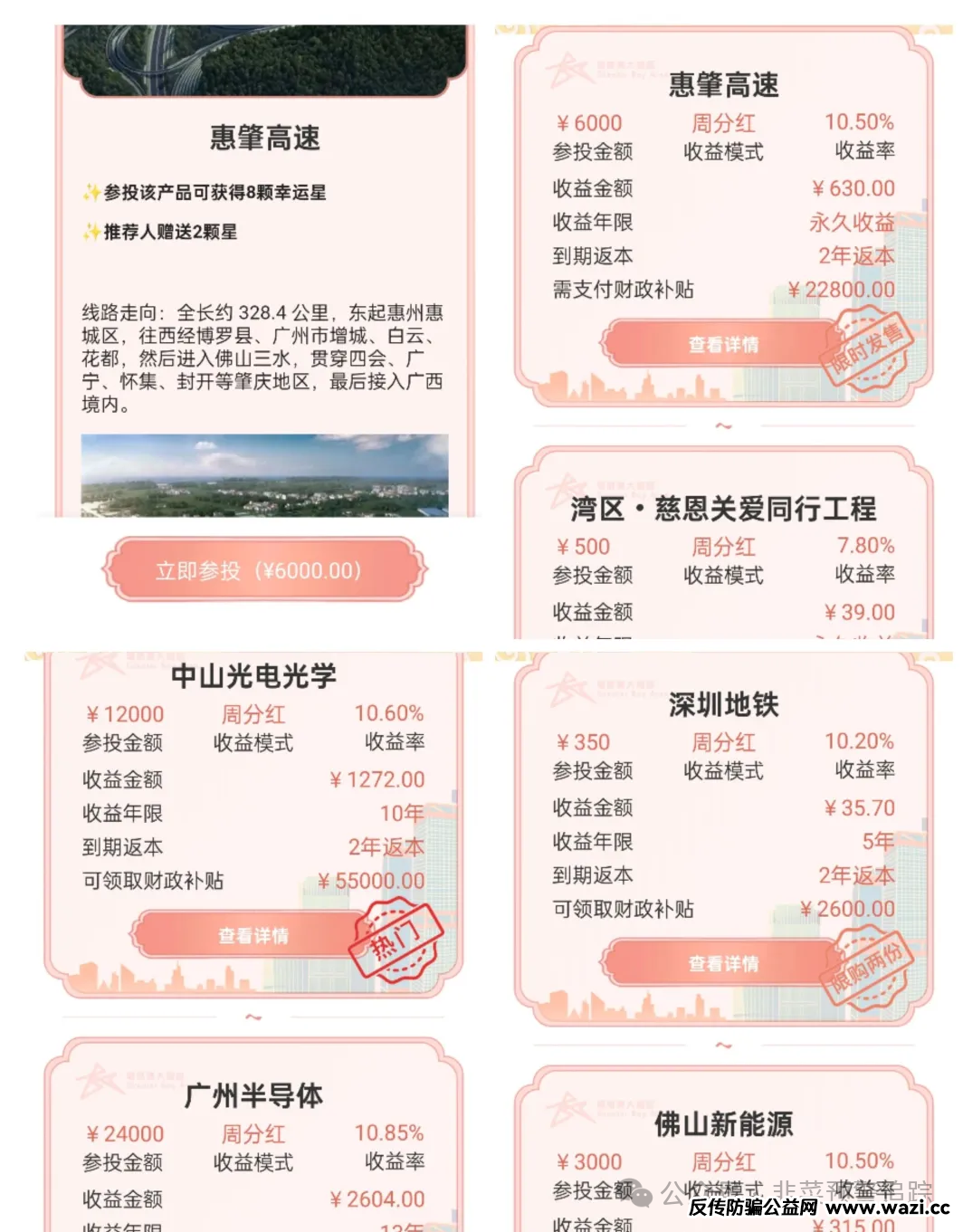 “粤港澳大湾区” 资金盘还采用了传销的模式来发展下线。注册领10000元补贴金、直推3人领68元补贴,设多种参投项目,收益率 10.20%-10.85%,有周分红、到期返本及财政补贴等模式,