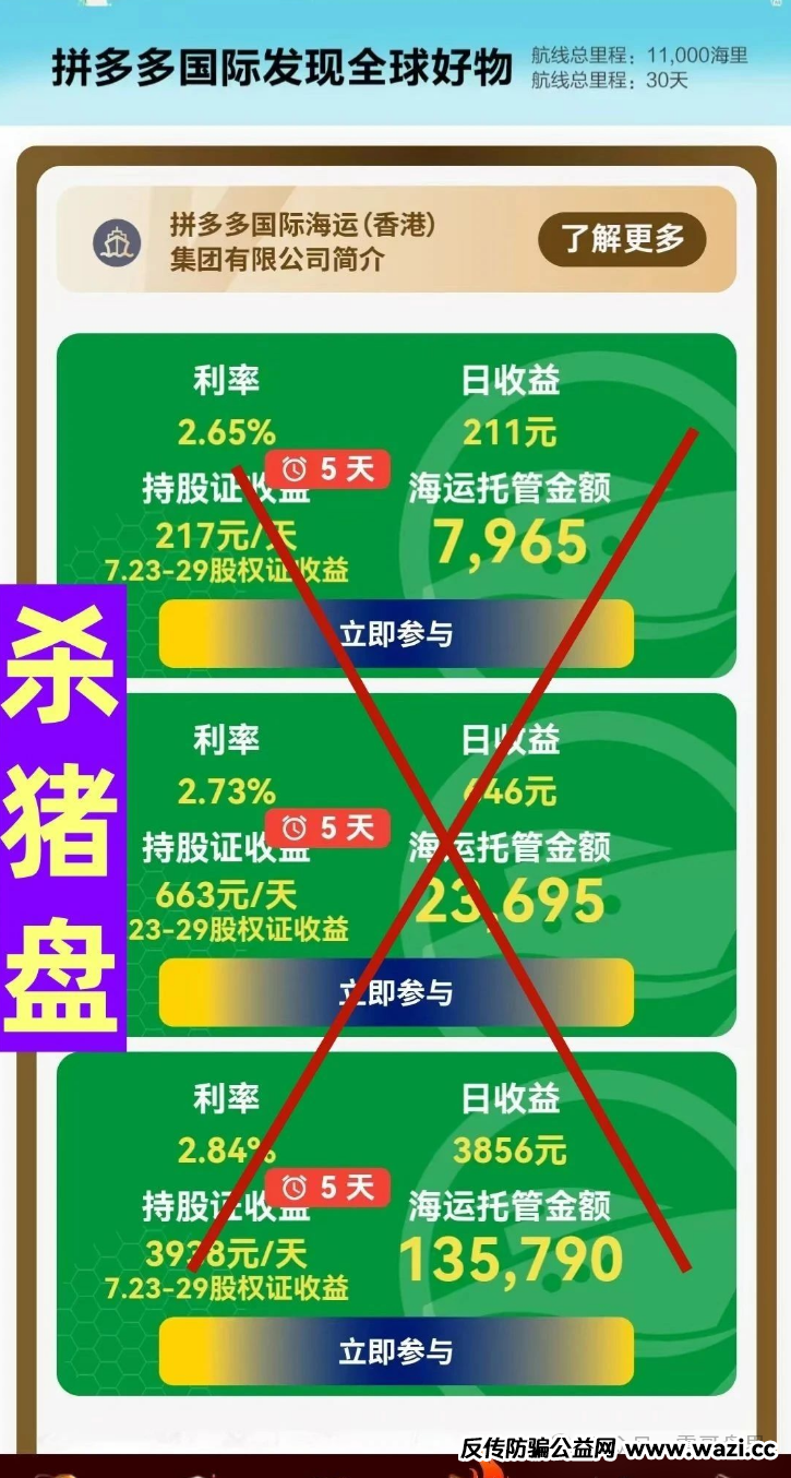 震哥查了查,拼多多官方早就发过声明,压根没搞过什么“国际资金盘”,全是骗子冒名顶替!这玩意儿一看就是杀猪盘,年化收益敢吹1000%,连专业搞资金盘的都摇头——泡沫这么大,不崩盘跑路才怪!