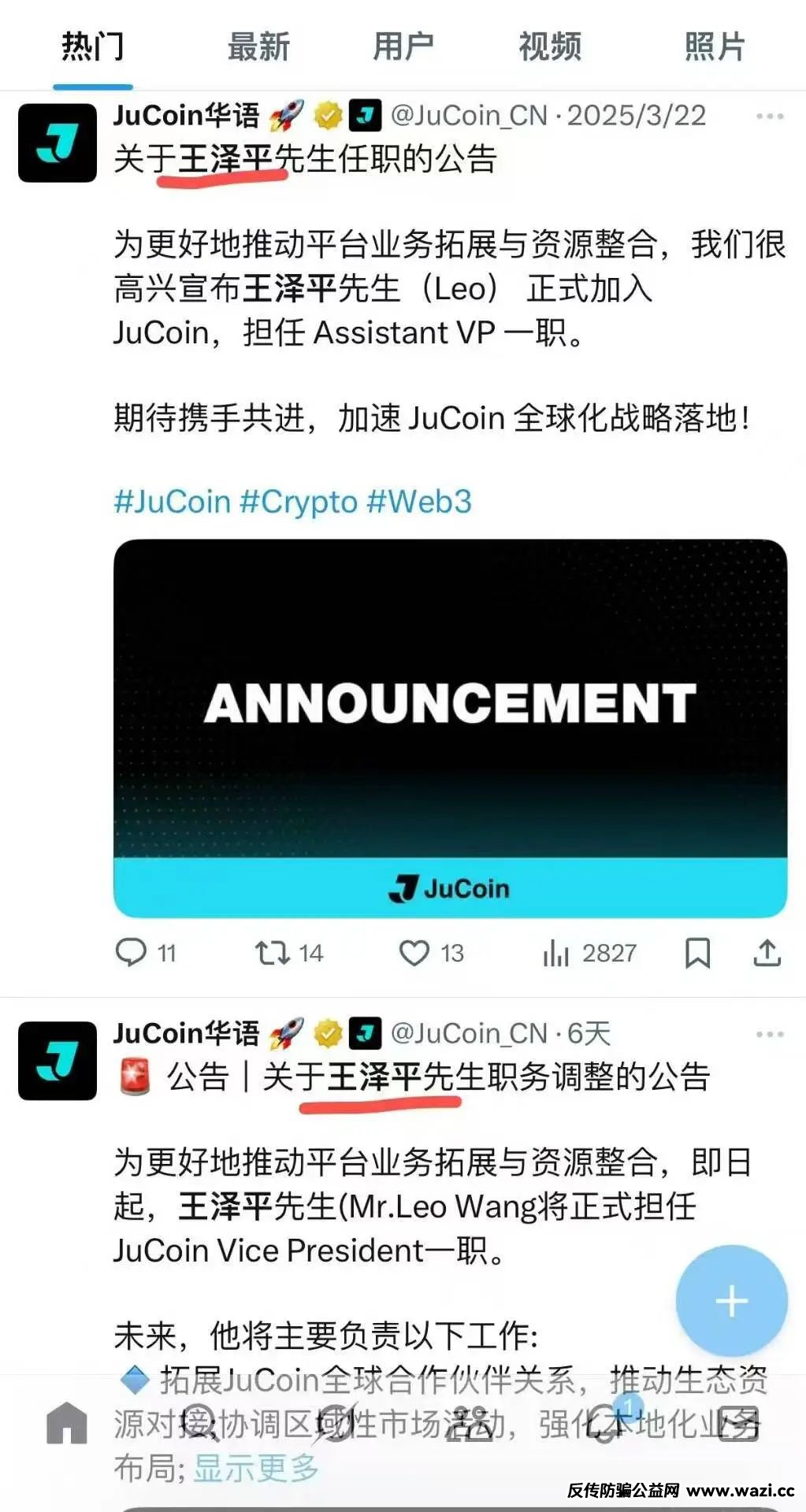 其次,相关信息显示:AJE做为聚币平台mini ipo板块的生态代币,且mini ipo板块为聚币副总裁王辉负责(公告以偷摸删除,有记录),王辉为AJE板块实际负责人,也就是AJE实为聚币平台子项目,聚币平台曾发布过王辉的任命,且聚币发公告称AJE为聚币优质项目聚币官方400万油买入AJE销毁,诱导投资人投资,才导致那么多人,那么多资金进入AJE。从这个角度分析,聚币对AJE事件应付全责。