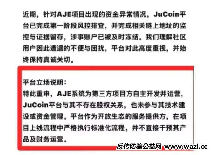 出事后,聚币换了一副嘴脸,撇清了一切与AJE的关系,这就是聚币的玩法。