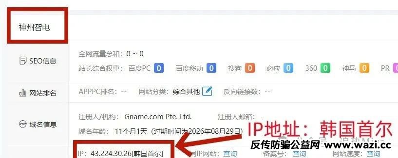 通过其下载链接与注册链接查询得知,神州智电 APP 的网站 IP 地址位于韩国首尔,并且没有任何网站备案信息。要知道,任何合法的 APP 都必须在工信部进行备案,仅这一点就足以说明神州智电 APP 的非法性。