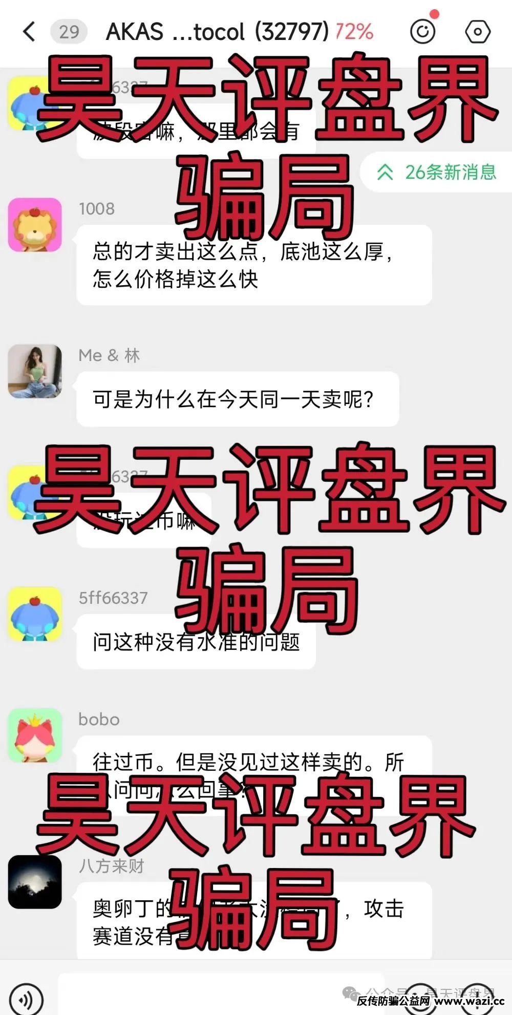 昊天评盘界:AKAS这个质押分红类资金盘骗局,昨天昊天就预警的时候说了,部分团队已经撤离,昨天上午后台还有骂昊天的,下午诈骗团伙就开始疯狂砸盘了,截止到发稿前直接跌了26%,操盘手人...