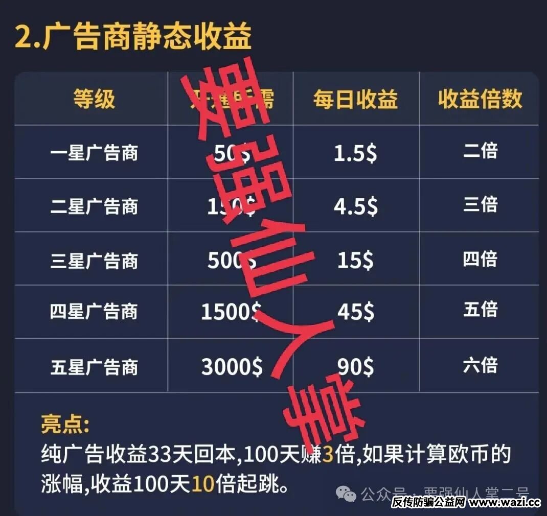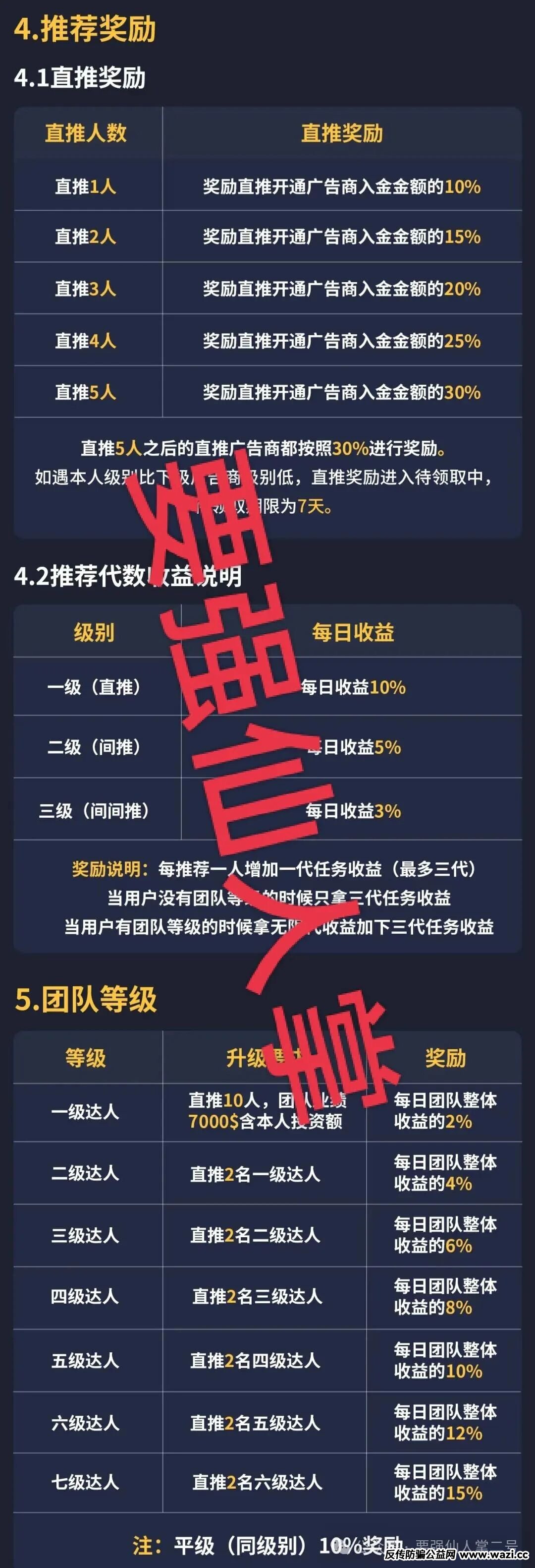 平台设置了从50U开通一星广告商到3000U开通五星广告商的等级制度,声称纯静态33天就能回本,纯广告就能获得如此高的收益。这种违背市场常理的高收益承诺,是资金盘骗局的典型特征。在正常的商业逻辑中,任何投资都伴随着风险,且收益不可能如此稳定和高额。然而,“OBEY欧贝电商”却用这种离谱的收益承诺,让投资者误以为找到了一条轻松致富的捷径,吸引他们不断投入更多资金,以获取更高等级的广告商权益和更多收益。