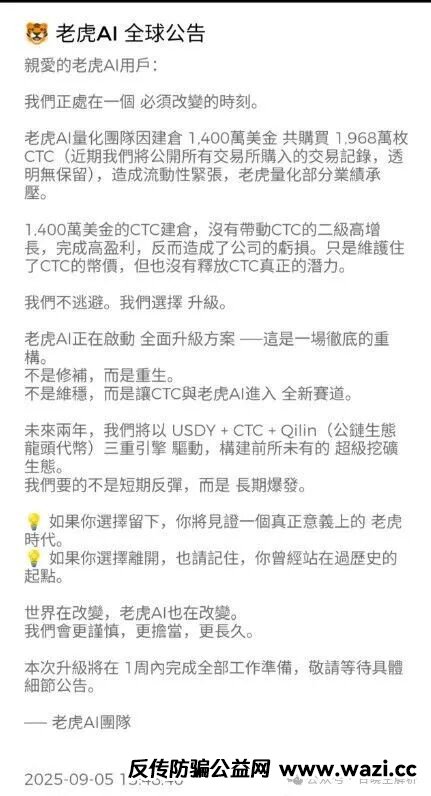 9月2日:老虎AI首次公告称系统遭“黑客攻击”,CTC价格暴跌99%,关闭充提功能,承诺72小时修复。