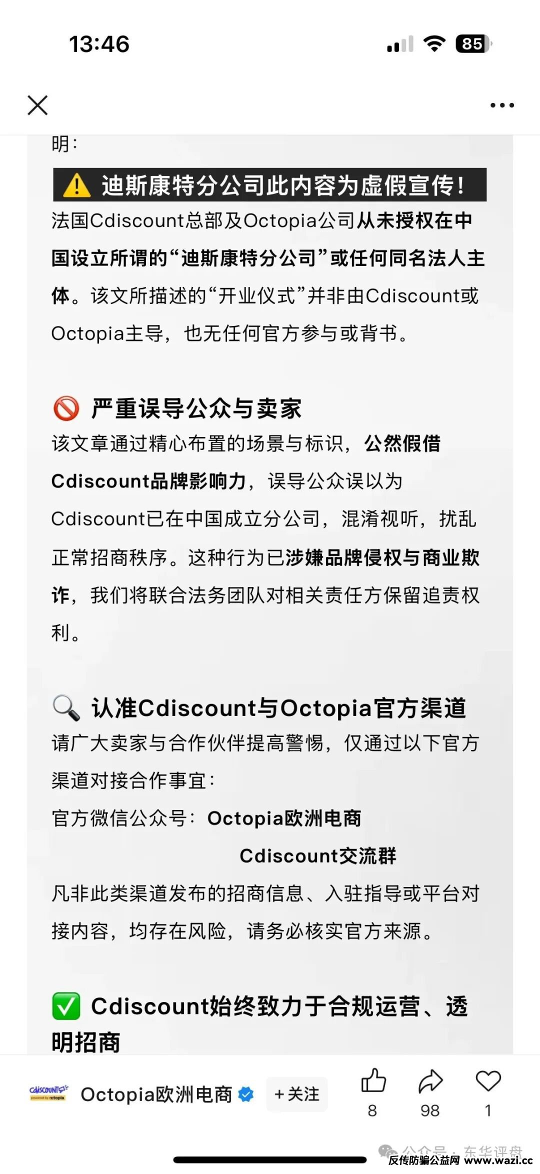 诈骗团伙声称:迪斯康特可不是 “单打独斗”,它背靠欧洲知名电商品牌 Cdiscount 。Cdiscount 有着深厚的行业经验和全球供应链资源,这意味着什么呢?未来,咱们在迪斯康特,不仅能轻松买到国内的优质好物,还能享受到来自欧洲、北美、东南亚等地的海量特色商品。想象一下,法国的时尚美妆、北美的数码潮品、东南亚的特色手工艺品,统统汇聚于此,而且价格还十分美丽。Cdiscount 在中国大陆的核心运营平台,正在全力整合全球资源,为商圈持续注入新鲜 “血液”,未来商品种类将不断丰富,品质也会更上一层楼,绝对能满足大家日益多样化的消费需求。而人家正规公司早就发过预警了: