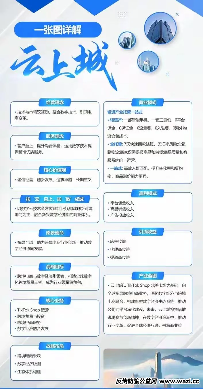 云上城TikTok骗局!它是打着跨境电商旗号的资金盘,运营公司为空壳,所谓授权是伪造。承诺超高回报,采用拉人头多级分销模式,符合传销定义。平台突然停止提现、关网,操盘手迅速转移资产跑路。已受害要保留证据尽快报案,转发文章让更多人看清骗局,守护血汗钱。