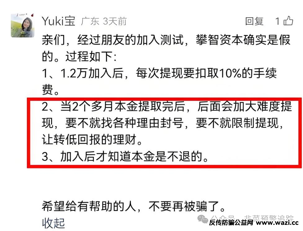 警惕攀智资本(西北资管)资金盘骗局!它打着资管旗号,行庞氏骗局之实,投钱后不拉人就被单割,群里晒收益多是托。项目方操作明目张胆,跑路前兆明显,受害者发声被屏蔽。高回报、拉人头项目多是陷阱,大家千万别参与,若已入局要立刻止损、保存证据、果断报警,别让血汗钱成他人跑路盘缠。