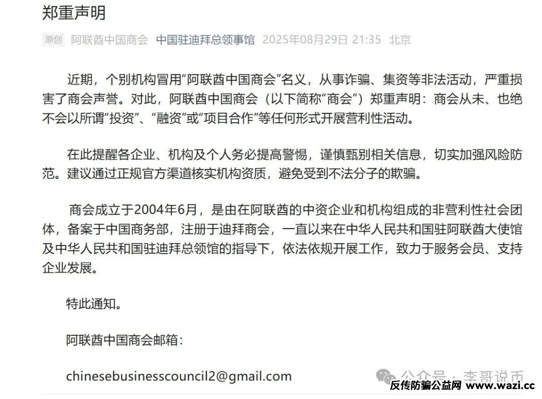 中国驻迪拜总领事馆与阿联酋中国商会近日发布郑重声明,明确指出个别机构冒用“阿联酋中国商会”名义,从事诈骗、集资等非法活动,严重损害了商会声誉。真正的阿联酋中国商会成立于2004年6月,是在商务部备案的非营利性组织,会员涵盖中石油、华为等200余家中企。