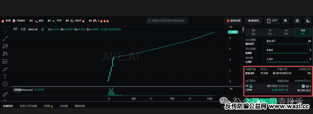 从FF代币7月上市,到现在正好不到3个月的时间。这不是我猜测的多么准确,而是了解这种资金盘模型,太暴利的情况下,确实是吸引人,但也正是因为如此也很快就会坠落。因为这个盈利模型根本就没法持久,3个月时间你怎么给人家前面的出金吧?因为很快就会面临出金压力,人家项目方说实在的,也没想着兑现,能够把资金池里的捞走就行,反正就是骗一波就走。