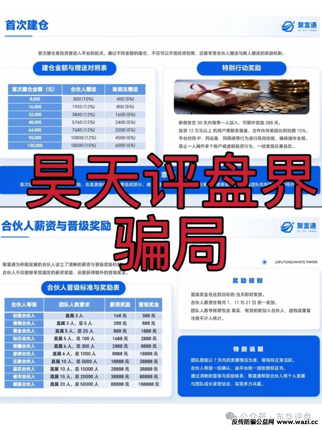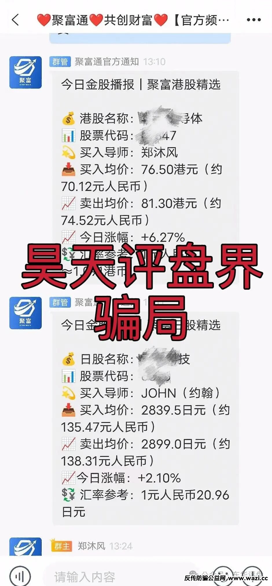昊天评盘界:今天昊天带大家来曝光一下一个叫“聚富通”的股票带单跟单类资金盘,今年也是出来了不少此类股票带单模式的盘,这个盘的系统app也和之前昊天曝光过的一样,这次诈骗团伙包装...