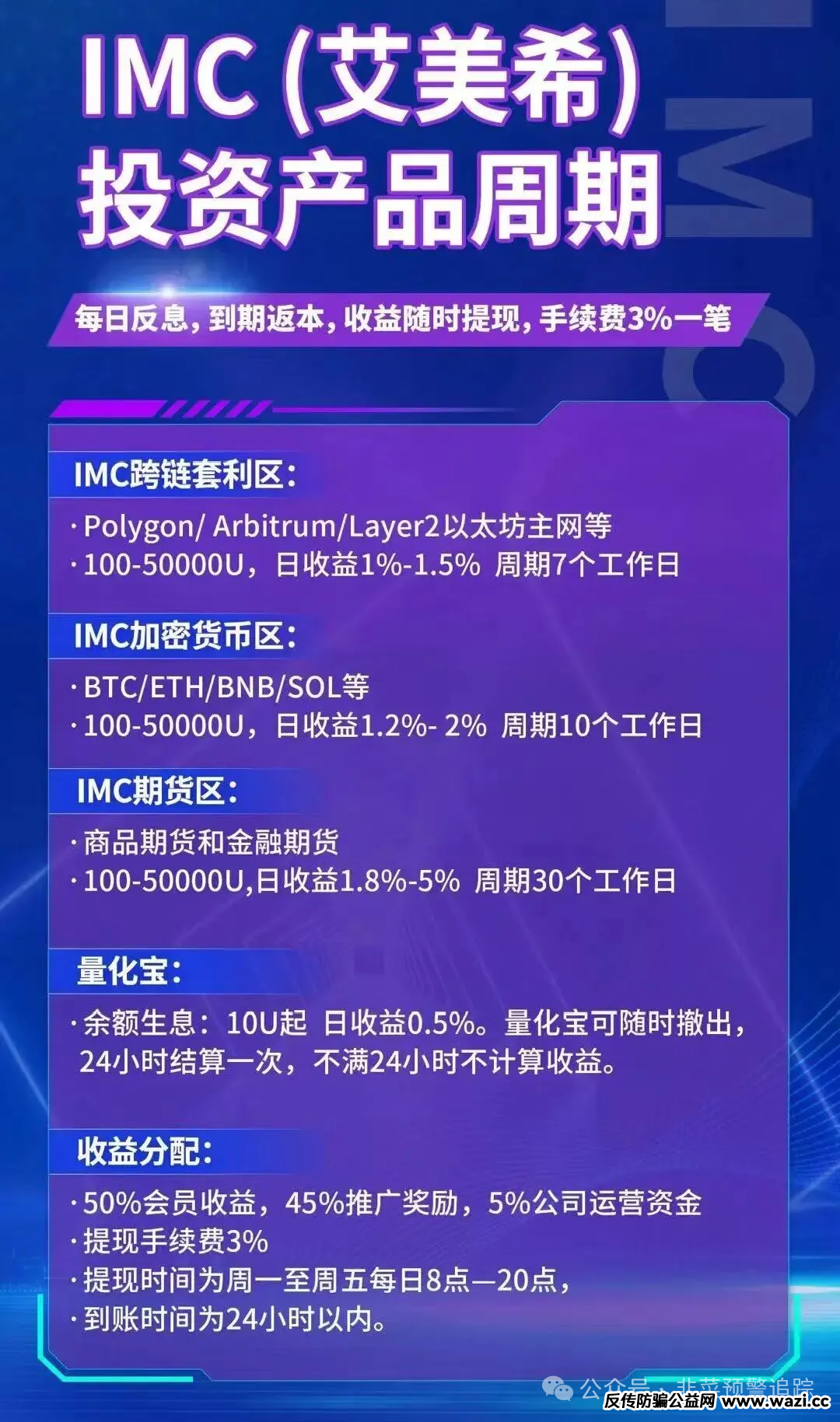 IMC(艾美希)资金盘今日上线,投资金额100-50000u,周期7/10/30个工作日。这类产品周期短的项目往往短命,操盘手难以长期维持盈利,大概率会快速跑路。年底诈骗高发,大家要提高警惕,别被短期高收益迷惑。同时,不要盲目跟风参与不明项目,避免财产损失。看到此类项目,请果断远离!