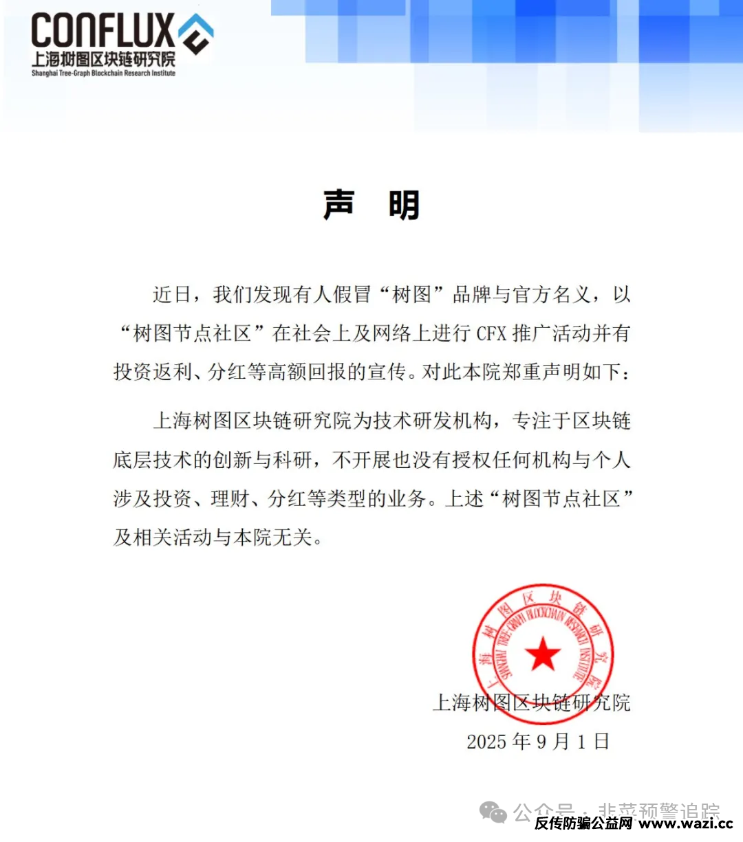 树图公链3.0,盗用其LOGO,推出共识算力矿机,以邀新人获奖励为诱饵,APP还带有病毒。上海树图区块链研究院声明不涉及投资理财业务。骗子常用高收益诱惑、空投糖果、传销式拉人等手段行骗。大家要通过官方核实信息,认清区块链本质,了解法规,谨防受骗!