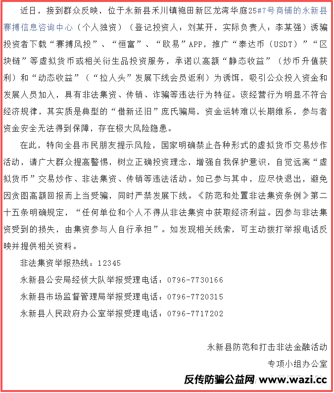 赛搏风投,其宣称炒泰达币月收益达20%,拉人头还能赚更多。但2025年9月10日,永新县防范和打击非法金融活动专项小组办公室发布文件,点名“永新县赛搏信息咨询中心”违法违规。该项目打着区块链、虚拟货币幌子,通过APP承诺静态、动态收益,实则是借新还旧的庞氏骗局。资金链随时可能断裂,现已单割随时会跑路。
