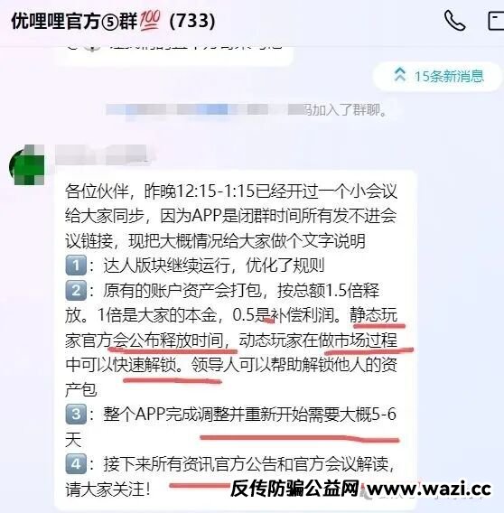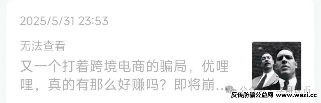 今天继续给各位讲的是“优哩哩”这个所谓的跨境电商资金盘骗局,目前还是停止提现,就连会员结算系统都看不到了,并且公告里也没说系统要升级到什么时候,会员群也依旧被禁言。上篇文章...