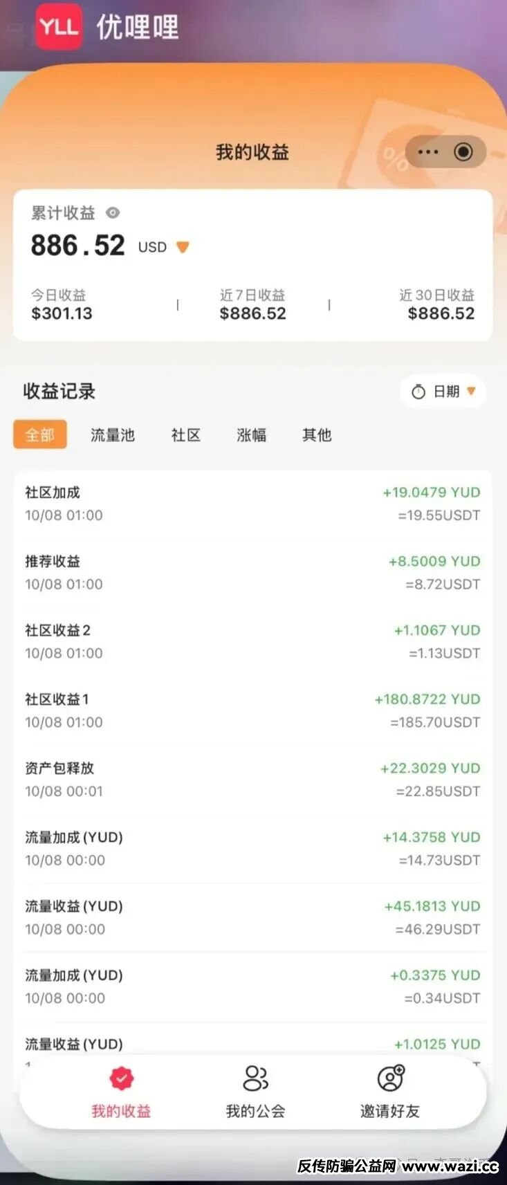 这种套路就是屡试不爽,之前很多盘子也是这样,先是升级三天,然后升级五天,现在说对接苹果商店,不知道具体哪天才能上线。有些盘子升级升着升着就没了,维稳团队会骗你,导师团队长也会骗你。但是你自己去看优哩哩项目方的钱包,里面的U流转记录不会骗人,你会眼睁睁的看着你的钱从你的眼皮子底下溜走。