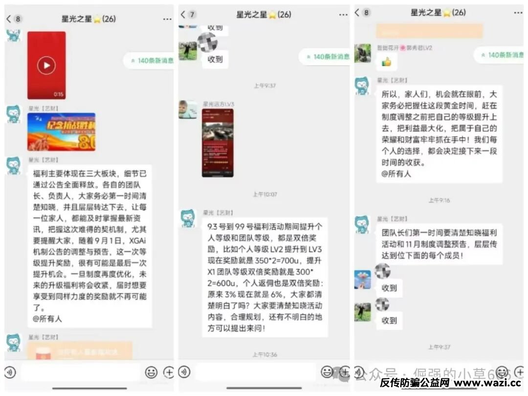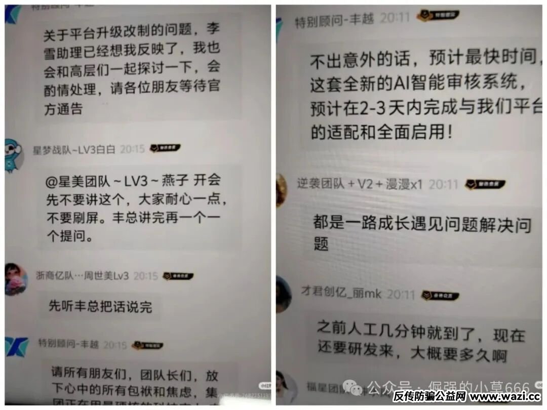 平台通过“拼团返利”“满级收益”“即时到账”等话术,刺激用户不断拉人头、冲业绩。微信群里,团队长们激情喊单,晒转账、晒豪车、晒合同,营造出“人人暴富”的虚假繁荣。可当新资金流入速度无法覆盖兑付需求时,崩盘只是时间问题。8月上线“共赢拼团”,9月推出“月返息”产品,10月突然转向“24小时返利”,产品周期不断缩短,返现压力急剧上升。,无一不是垂死挣扎的信号。