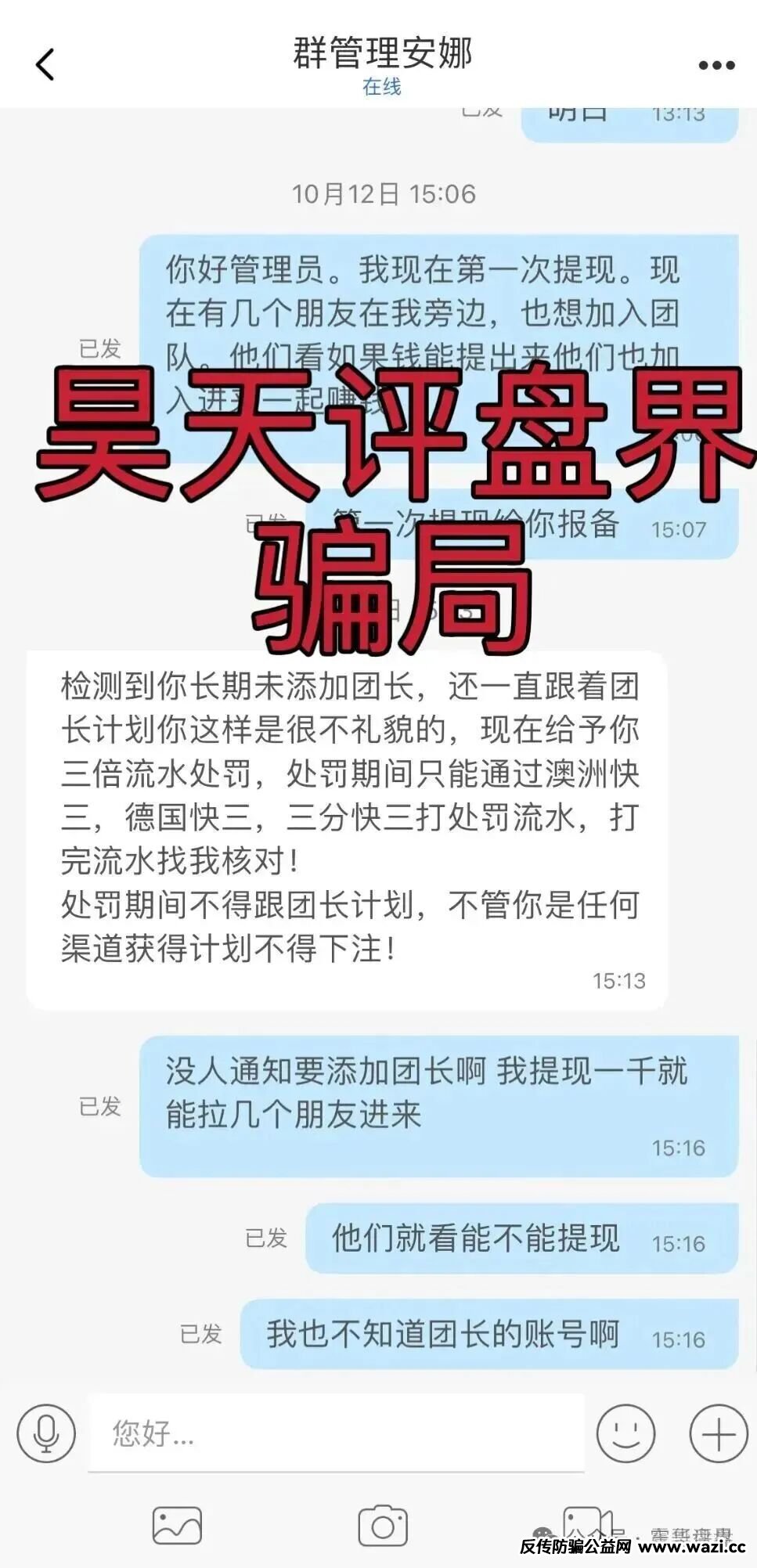 朋友们,我是震哥。今儿还得再提一嘴“万利国际”这个老演员,它就是个打着带单买彩票旗号的资金盘,我早就曝光过好几次了。这帮人真不消停,基本上每个月都得找茬,单方面收割一波会员。这回他们又玩新花样了,说啥“检测到你长期不添加团长,太不礼貌了”,然后就直接罚你三倍流水,还不让你正常提现。