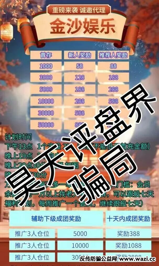 昊天评盘界:近期不少粉丝给昊天爆料了一个叫金沙娱乐的彩票跟单类资金盘骗局,据知情人爆料此盘目前开盘有几个月了又冒充新盘开始各种推广拉人,前天也是单割了一部分会员,加上部分团队已经撤离,高度预警,即将崩盘跑路!随着支付方式的改变,被国家定性为非法的网络彩票在利益的趋势下,不少人还是在上面投入了大量的资金,高额的回报,让这些人不惜触犯法律,铤而走险也要玩一玩。群里导师跟单,吸引的都是不劳而获、贪婪的人,他们让玩家群里跟单买网络彩票,前期肯定让你尝点甜头,后面等你加大投资或者不能发展其他人的话就会被割,这种彩票骗局受害人往往轻则负债累累,重则家破人亡。希望大家远离这种骗局,这种骗局的套路和模式就不用昊天多说了往期文章曝光过很多了: