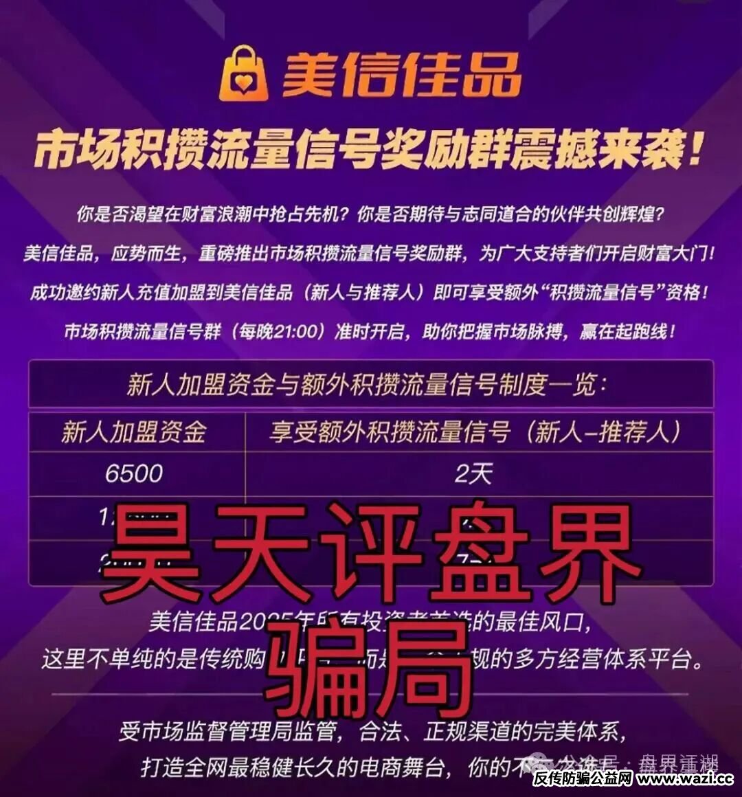 近期不少粉丝给重楼爆料了一个叫美信佳品冒充电商的跟单分红类资金盘骗局,开盘半年了,最近也是大量单割会员,据知情人爆料操盘手包装的导师李昊明诈骗过亿,高度预警,即将崩盘跑路!重楼看了一下属于典型的杀猪盘,之前也是大量投诉反诈文章来掩盖真相,知情人爆料目前大团队已经撤离,市场乏力,高度预警,即将崩盘跑路!