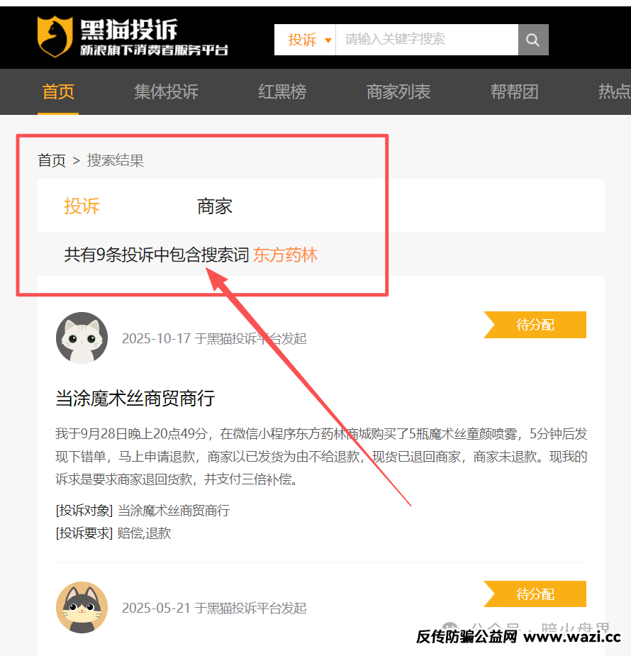 我们可以清楚的看到从20245月——202510月,该平台共有关于“东方药林”的9条投诉。其中涉及到关于产品使用效果、产品质量、虚假宣传、拒绝退款等几个主要方面。其反应最强烈的还是消费者在平台购买商品后,在未发货的状态下,消费者申请退款,对方却拒绝退款。
