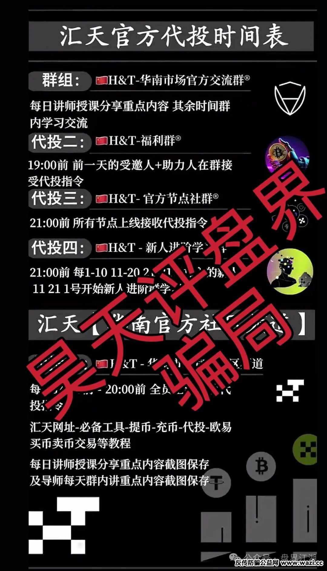 昊天评盘界:汇天交易所合约跟单类资金盘骗局,之前昊天预警过2次,包装的公司在香港,汇天资产成立于2024年,先后在美国、英国注册设立总部,2025年正式进驻亚洲,在中国香港设立首个亚洲分部。开盘也是几个月了,市场官方诈骗群里每日诈骗团伙所谓的平台讲师会进行授课洗脑,19:00前一天的受邀人+助力人在群接受代投指令,21:00前所有节点上线接收代投指令,每天14:00前-20:00前全员上线接收代投指令然后根据指令进行跟单交易,诈骗流程就是汇天网址-必备工具-提币-充币-代投跟单等,相信看过昊天文章的粉丝都已经安全撤离了,据受害者爆料目前有3万多会员,操盘手圈钱过亿,大量单割会员,高度预警,即将崩盘跑路!直接上单割的证据: