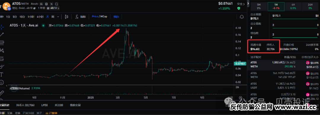 看清楚一天的交易额里面?市值75亿美元的品种,1个小时交易额172美元,1天交易额是多少呢?2万美元!并且持币人数是多少?22726人!这很明显就是没有什么流通量的,也没什么人交易。