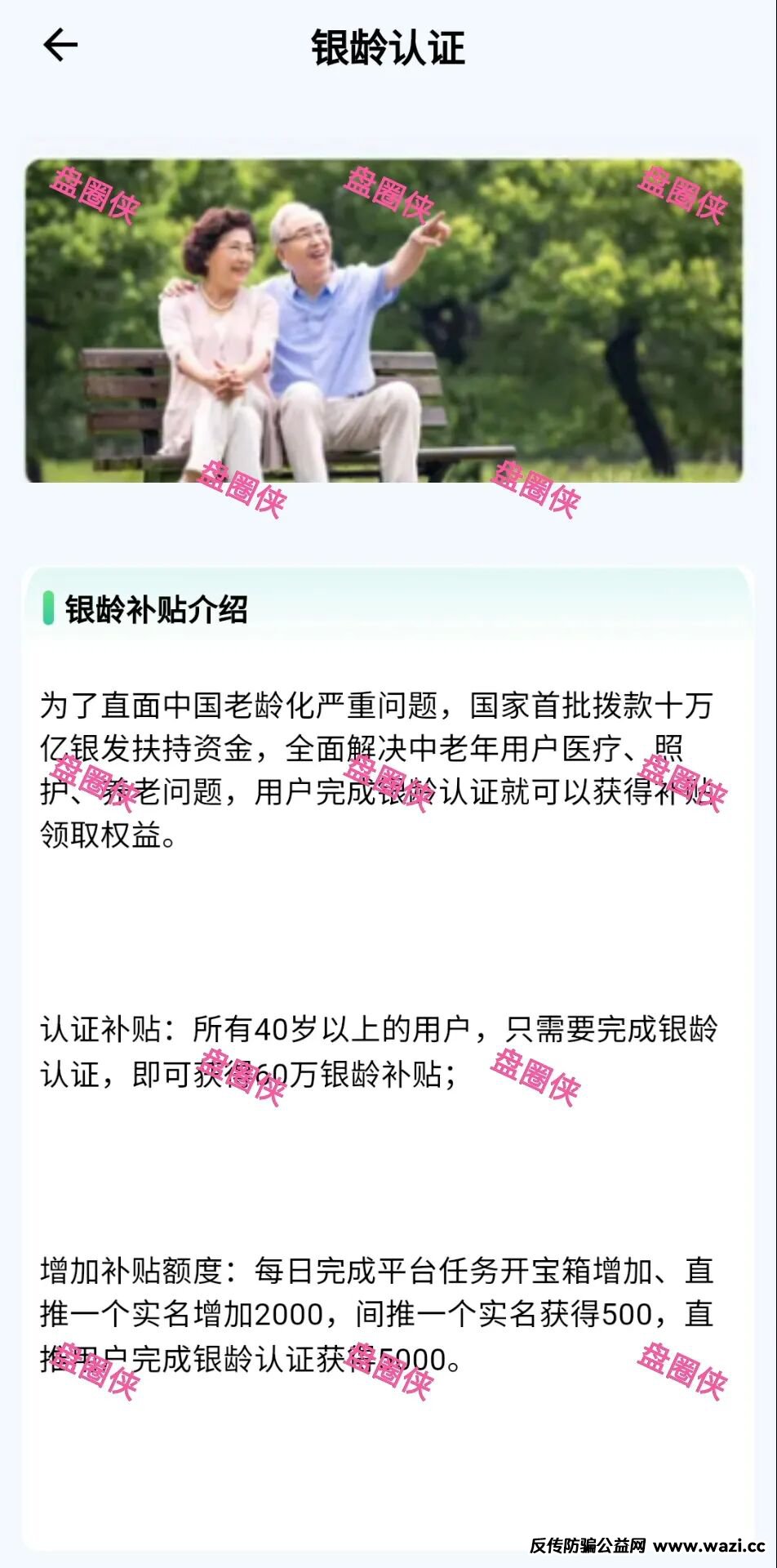 补贴可通过每日完成平台任务开宝箱增加、直推一个实名增加2000、间推一个实名获得500、直推用户完成银龄认证获得5000,目前APP十分卡顿,暂未上线产品。