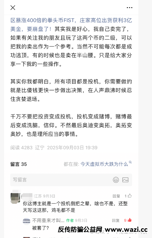 8月末9月初,我自己出完货之后,我给大家也写了一篇文章,告诉大家,差不多了,该提裤子走人了,原文链接在下面: 快出货!假公链,真骗局!盘古社区暴涨400倍的拳头币FIST,庄家高位出货获...