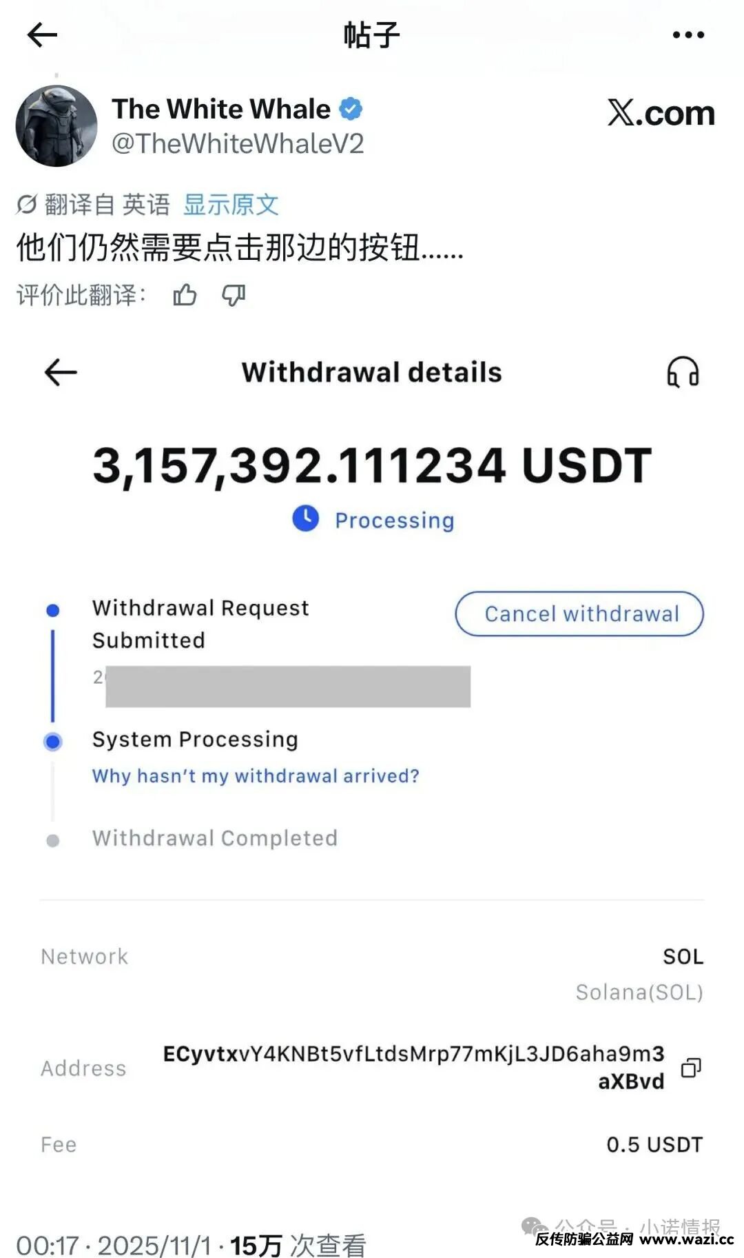 最近事情的起因是:英国有个名叫白鲸的kol在抹茶盈利了300万美元,而抹茶不让提现。