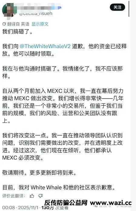 抹茶MEXC交易所这边一看事情闹到这么大,还碰到懂法的,瞬间送了,连夜请示高层,让这位kol把资金提走了。