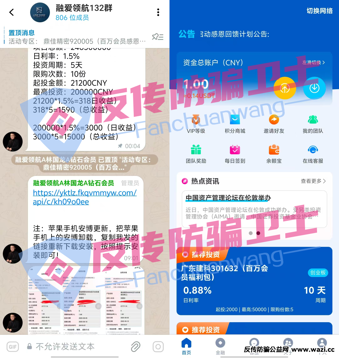 3、“新创人”APP:冒充香港某公司,以 “农业生态” 为幌子,通过专属聊天软件和群聊,以每日红包诱导入群,再由导师洗脑、晒单营造赚钱假象,推出以虚拟币投资的质押分红项目,承诺日化高利率,设置农户、地主等级制度鼓励拉人头发展下线,同时以可退单但需交违约金等规则牵制投资者,实则为诈骗洗钱的资金盘,崩盘或跑路后投资者资金无法追回。