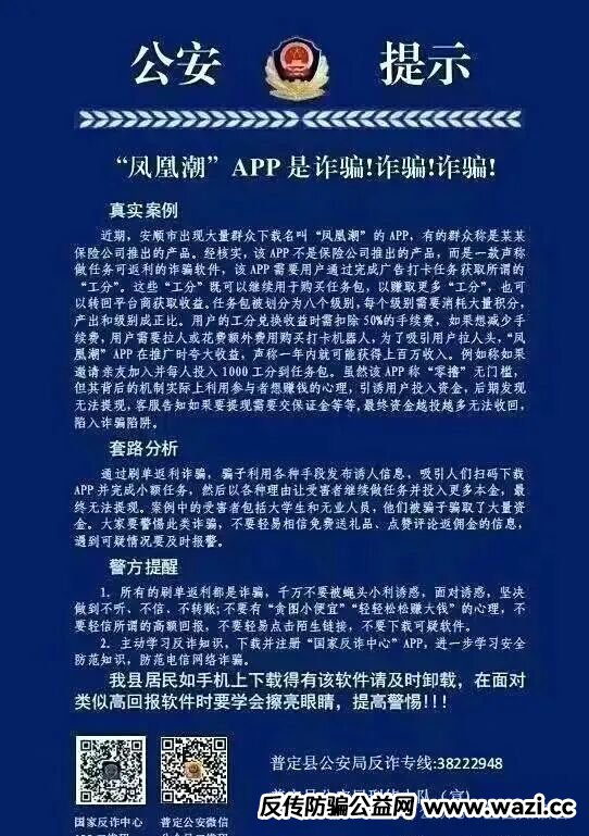 早在 2025 年 1 月,遵义市市场监督管理局就发布风险预警,明确指出 “凤凰潮” 的运作模式与组织、领导传销活动高度相似。安顺市警方也核实,该 APP 并非所谓 “保险公司产品”,而是以任务返利为诱饵的诈骗软件,已有大量群众受骗。湖南省委金融办更是提醒,任何脱离实体经济、依赖人际网络扩张的 “创新模式”,最终都难逃崩盘命运。