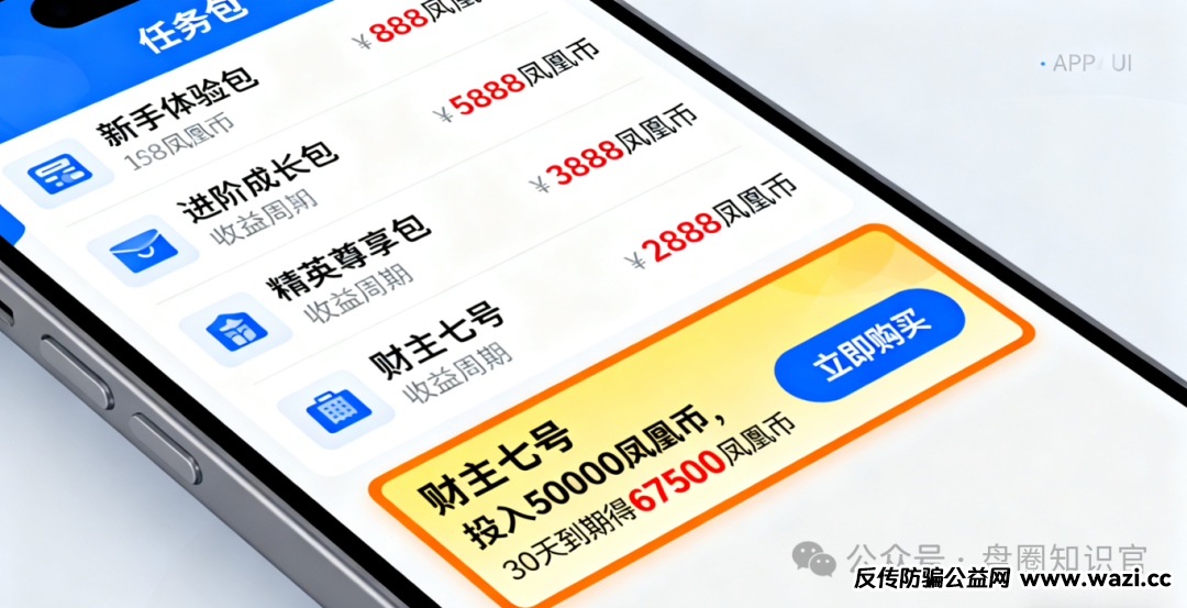 当用户积累一定 “凤凰币” 后,平台便开始推销不同级别的 “任务包”,价格从几百元到数万元不等。更诱人的是其收益承诺:最高级别的 “财主七号” 任务包投入 5 万 “凤凰币”,30 天就能获得 6.75 万 “凤凰币”。但这些收益全基于平台操控的虚拟积分,提现时不仅要扣除 20%-40% 的高额手续费,还面临审核周期长、到账延迟等问题,所谓 “高收益” 根本难以兑现。同时,平台还通过限时活动、涨价机制制造 “凤凰币” 升值假象,诱使用户不断追加投资。