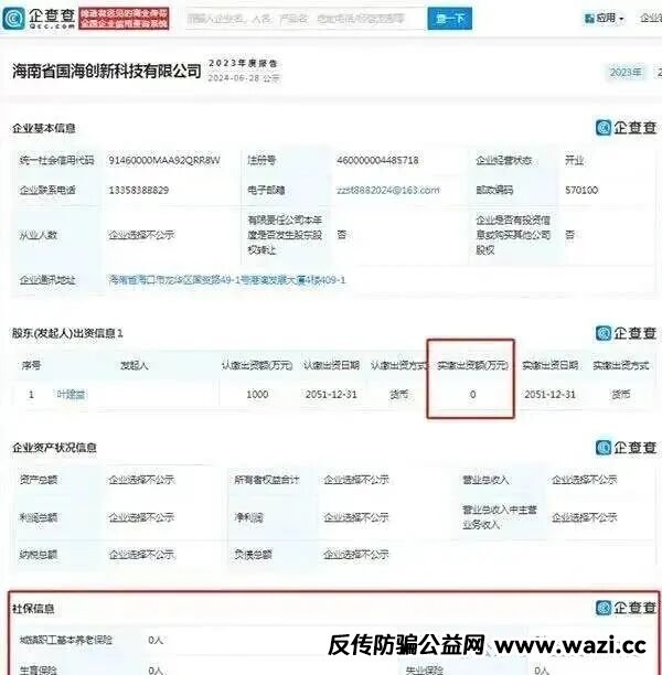 “凤凰潮” 对外宣称运营主体为海南省国海创新科技有限公司,主打 “赋能实体经济” 的噱头。但企业公示信息却暴露了其空壳本质:公司注册资本 1000 万元,实缴金额为 0 元;2023 年度社保缴纳人数全为 0,从业人数、营收状况等核心信息均选择不公示。一家没有实际资金投入、没有员工保障的公司,根本不具备支撑所谓 “创新盈利模式” 的基础,其宣传的可信度从根源上就站不住脚。