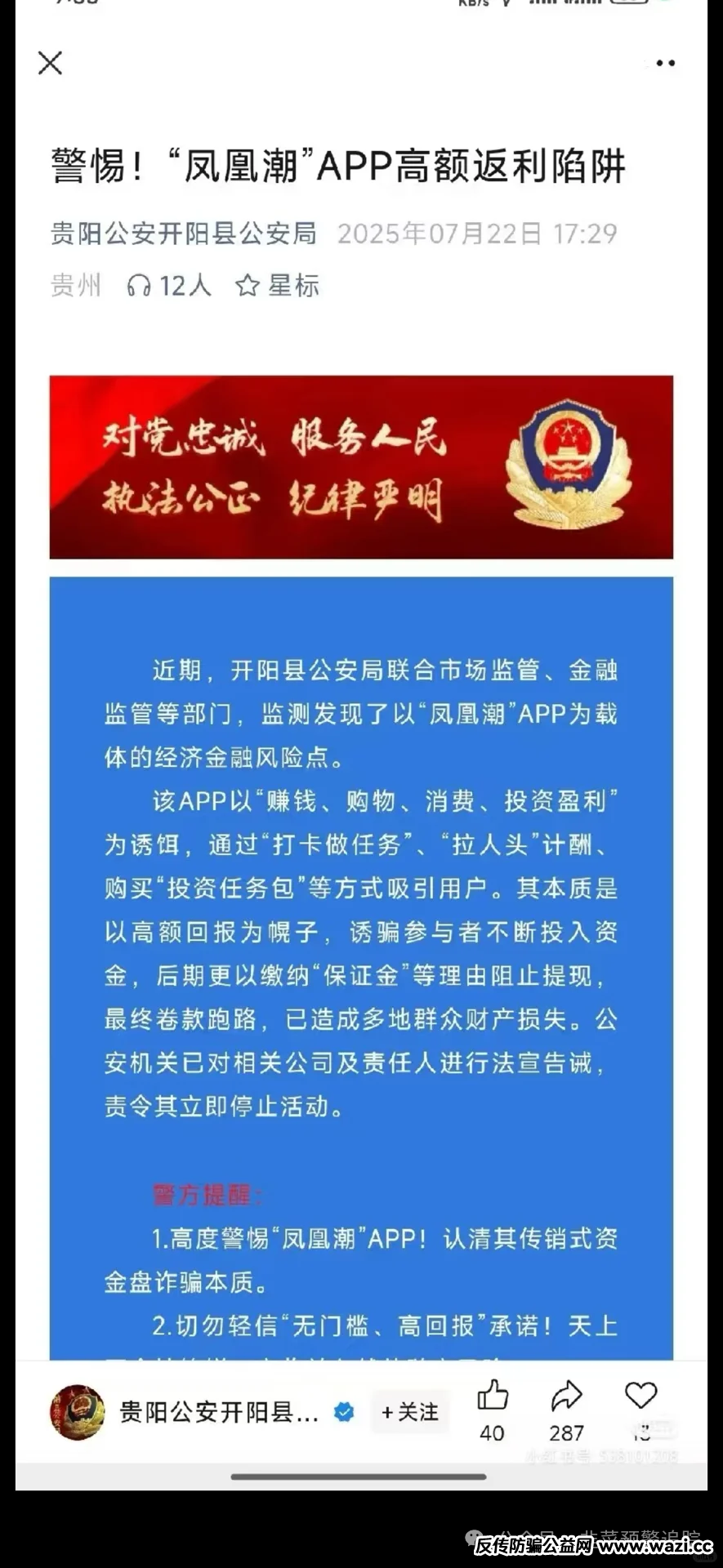 凤凰潮是高危资金盘,即将跑路。它以“工分”传销式运作,从“零撸”到“投资”诱导用户。零撸靠打卡获虚拟数字,前期能提现,长期累计收益诱人,引你做代理;“生钱”模式无盈利基础,靠新资金付旧收益,是“庞氏结构”,还营造“工分”升值假象促追加投资。别让贪念作祟,快远离,避免血本无归!