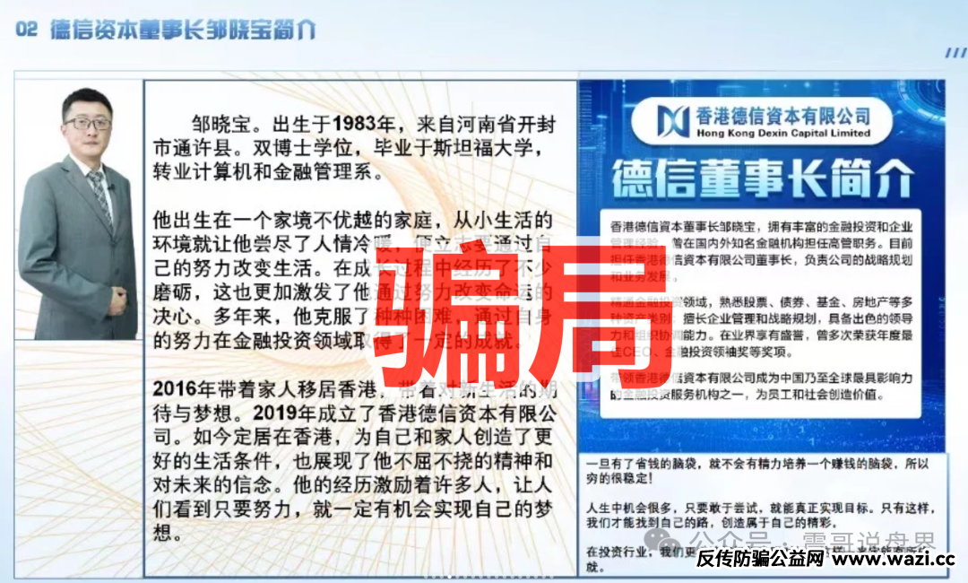 德信资本这个VT交易所跟单盘,是鑫康佳骗局换了个名字又来了。开盘没多久就开始收割会员。 那个自称邹晓宝董事长的,其实就是鑫慷嘉黄鑫本人。他们编造合作协议,说提币只要20%手续费,全...