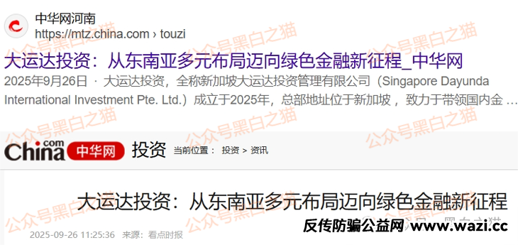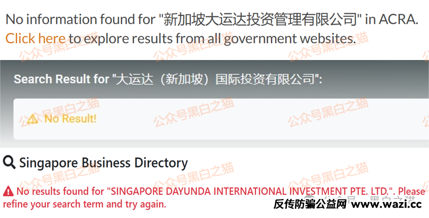 在整个内部宣传、抖音上显示的就有不同的公司名,搜索词就有三个,新加坡大运达投资管理有限公司、大运达(新加坡)国际投资有限公司、Singapore Dayunda International Investment Pte. Ltd.