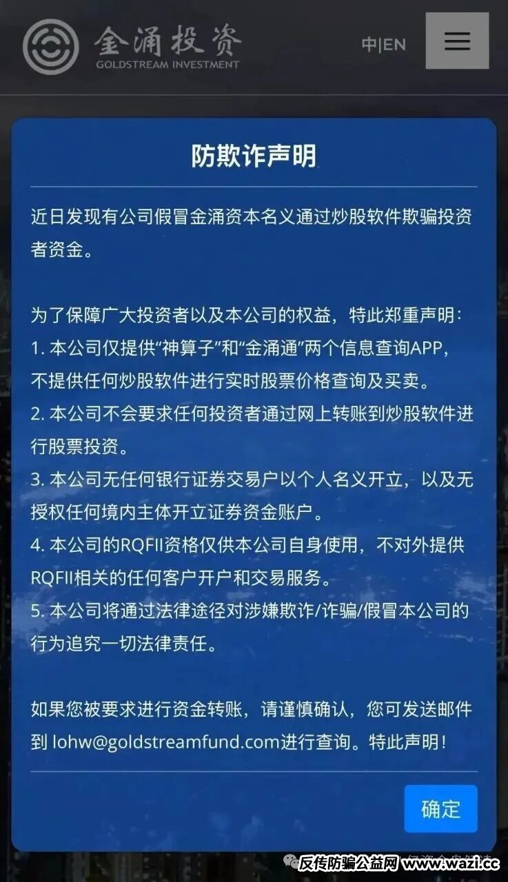 当前诈骗平台“金涌投资Goldstream”,只是套用了正规公司的名称和背景信息,实际毫无关联!正规金融机构已明确发声明撇清关系,仍在参与金涌的家人,请立刻停止所有加金操作,第一时间发起提现申请,哪怕损失部分收益也要及时止损; 已提现成功的用户,务必远离该平台,切勿被后续“高返利”诱惑再次入局;天上没有掉馅饼的事,牢记不贪,就不会上当受骗!