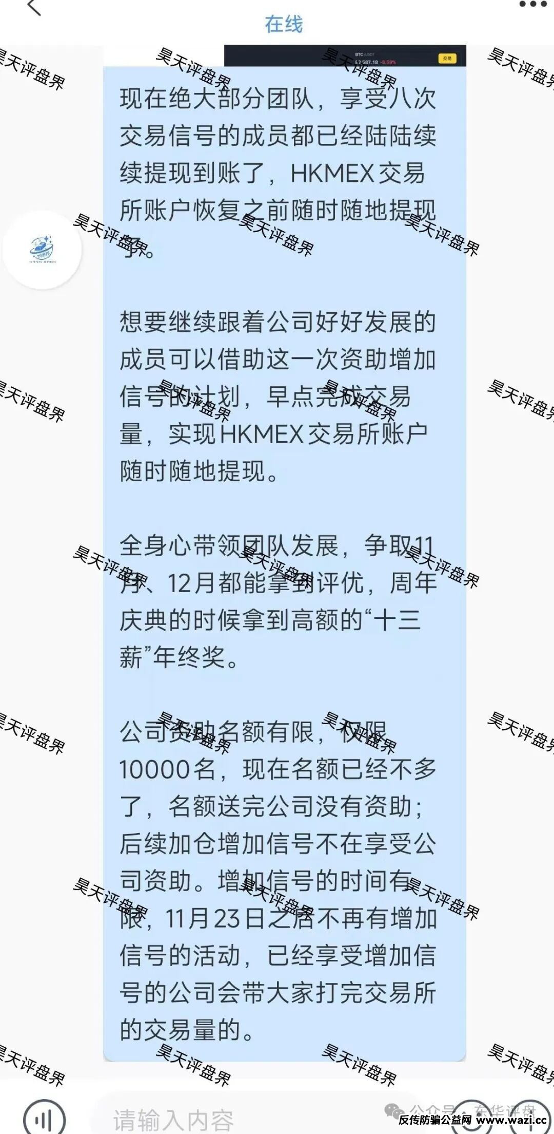 昊天评盘界:HKMEX交易所(澳门辉煌火炬联盟)资金盘骗局,昊天预警了几次了,11号的时候昊天就发文章说了,搞打码量才能提现就是二次收割,还有各种再次充值可以提现的活动,都是为了割最...