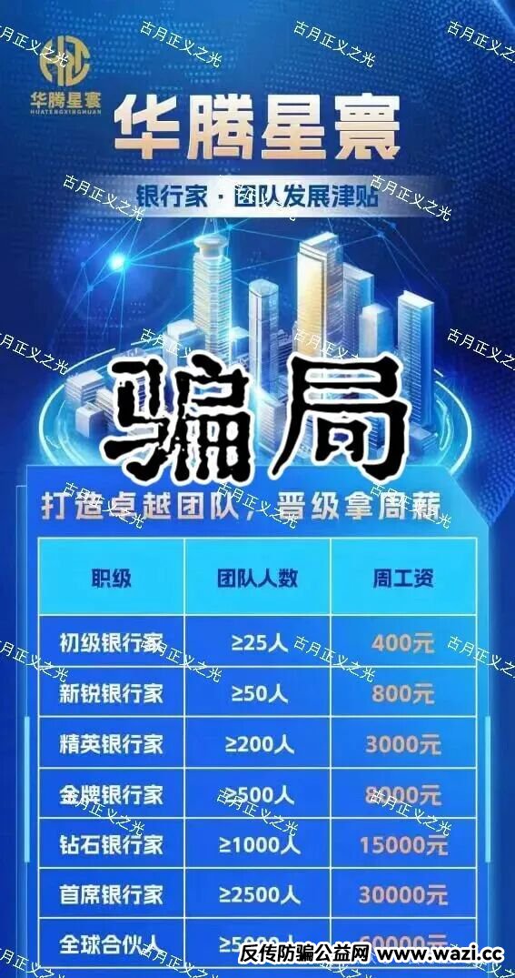 指出真相的人,会变成傻子和骗子的共同敌人,大家好,我是古月,“华腾星寰”的项目网站内容经不起查询,小编就以官网上标注的团队成员进行甄别,这种一看就是直接p图的,打着境外机构用诈骗APP来吸引内地投资人入局,USDT充值的,可以直接判断全部都是骗局。这个骗局一个是项目充值APP,一个是内部聊天软件,是目前灰产盘为了躲避国内社交工具封杀的方式,很多混迹盘圈的看到了都知道,模式团队发展按人数分职级,如团队长前五代激活≥5000人周薪60000元;团队激活达30000人奖价值200万商品房;客户拓展多层收益,充值除了银行卡还有USDT,一看就是杀猪盘,马上崩盘跑路那种...