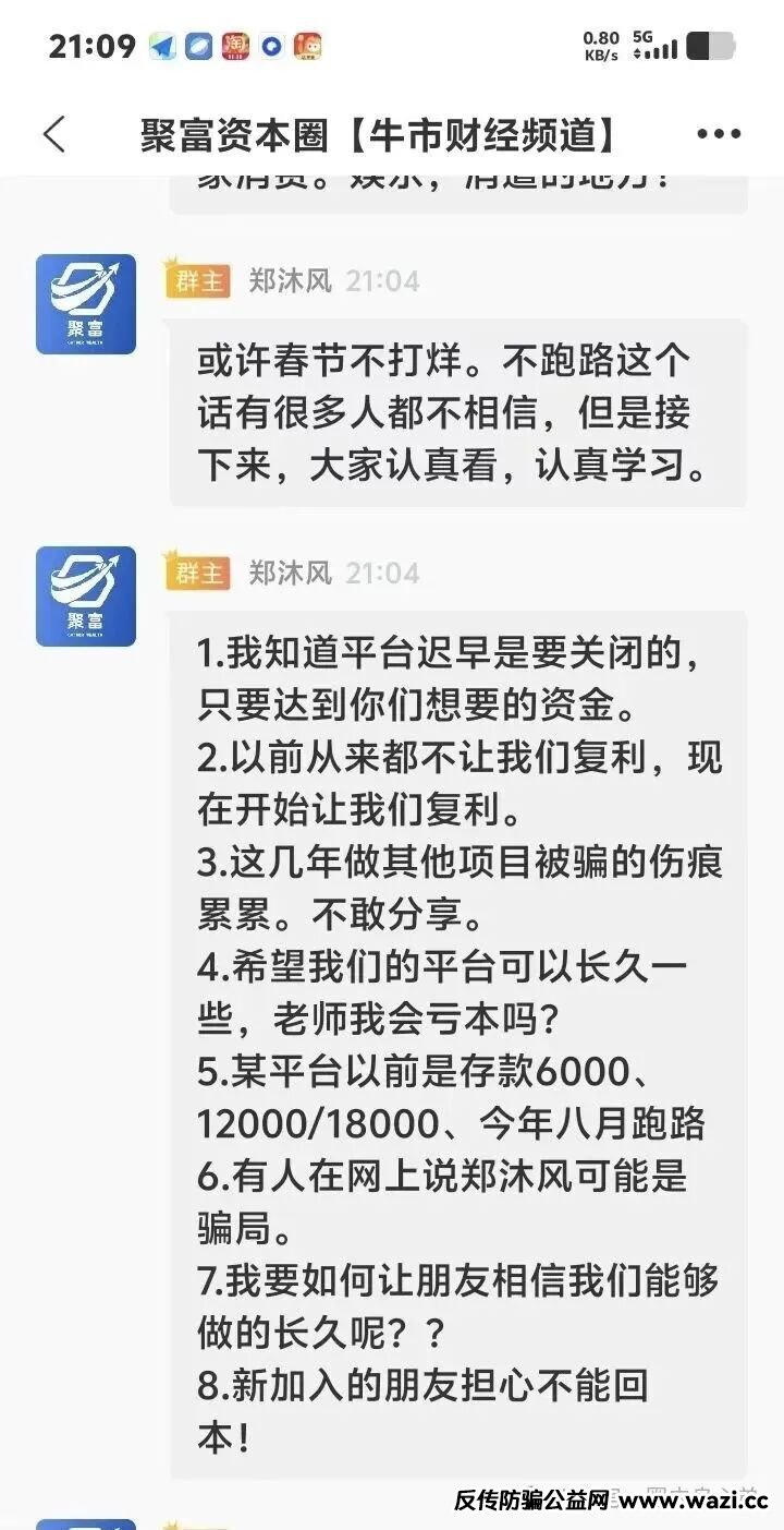 今天粉丝前来咨询一个项目,聚富通股票跟单,所谓话术还是老三样,有内部聊天群,有专门老师带单,大多数都是一样,群里洗脑,营造赚钱效应。
