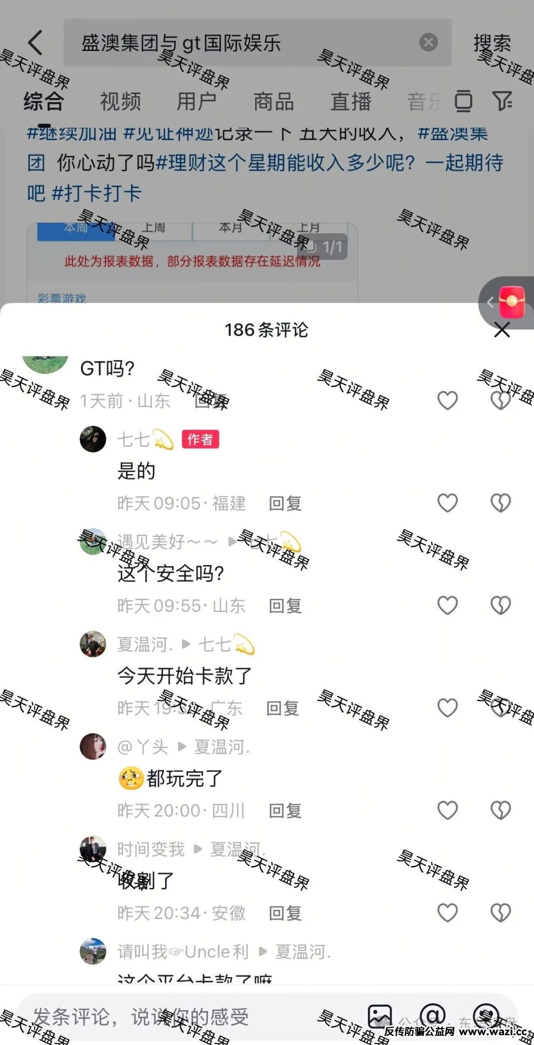 昊天评盘界友情提醒:GT国际(盛澳集团)彩票跟单类资金盘骗局,已经彻底崩盘了,操盘手圈钱几亿,提现要求打码量,下一步就是二次收割了,建议直接报警维权吧!近期知乎,小红书,微博,抖音等app都有冒充昊天的诈骗团伙,记住了我们不做项目,更不会去推广任何项目,除公众号外其他一律不是本人,切勿上当受骗!